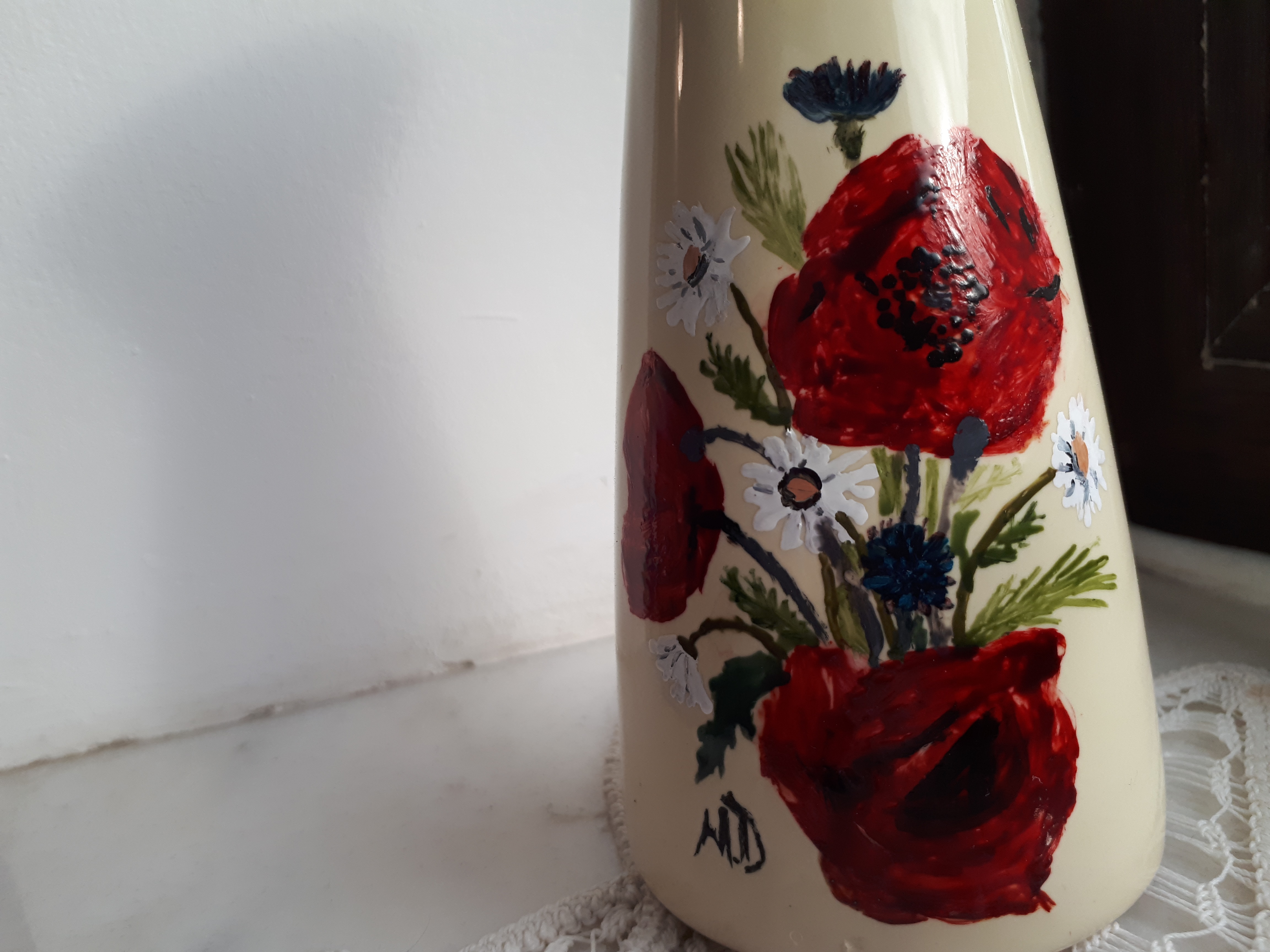 Vază pictată manual cu vopsele speciale pentru sticlă și ceramică.